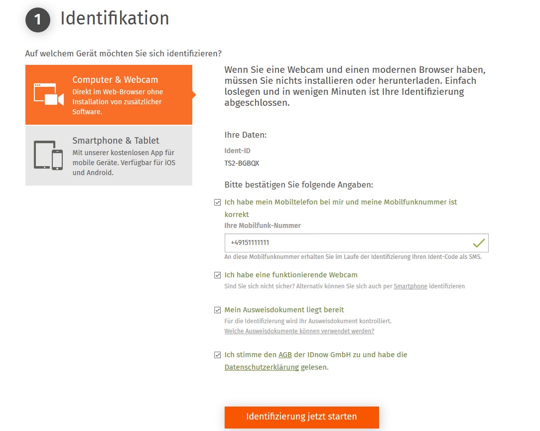- The user decides whether he wants to carry out the digital identification with his smartphone (IDnow mobile) or on his PC (IDnow web).