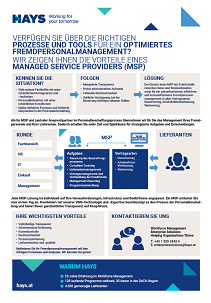 We ensure effective and efficient management of your external personnel. In your company, the Managed Service Program (MSP) functions as an integral part of HR or procurement and covers all aspects: from supplier management and control of the procurement process to management of the various types of contracts (service contracts and contracts for work and services).