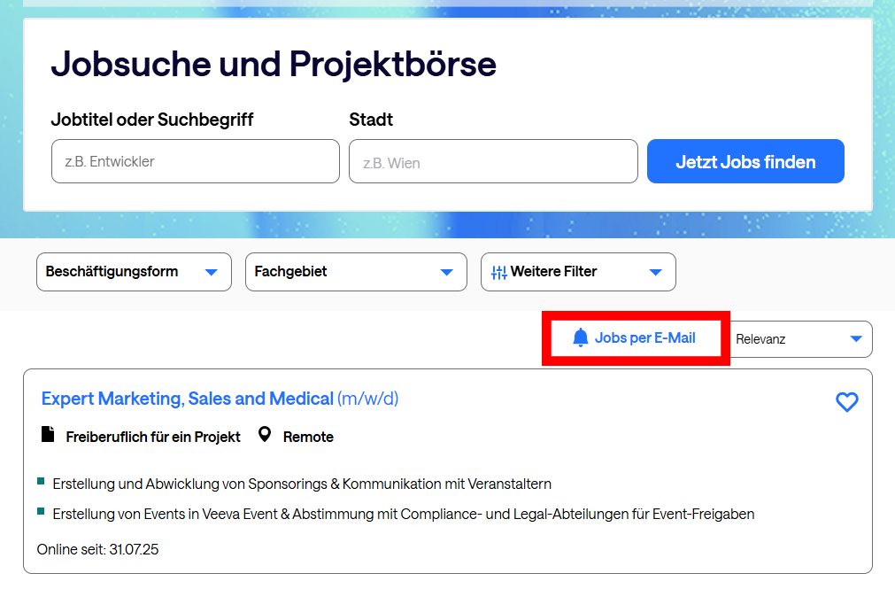 Navigieren Sie zu unserer Jobsuche und Projektbörse. Suchen Sie mit einem Begriff und den entsprechenden Filterkriterien nach einem Job oder einem Projekt.