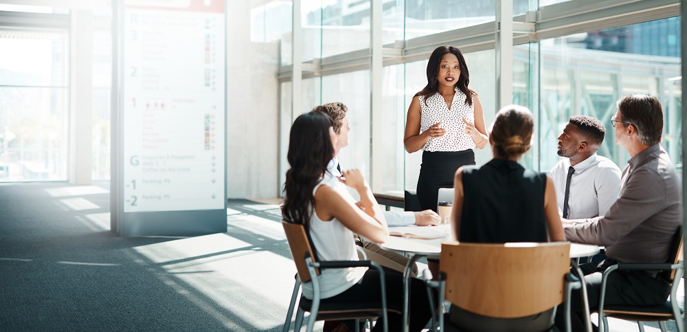 A diverse team sits at a round wooden table in a large, wide meeting room. One team member is giving a presentation.