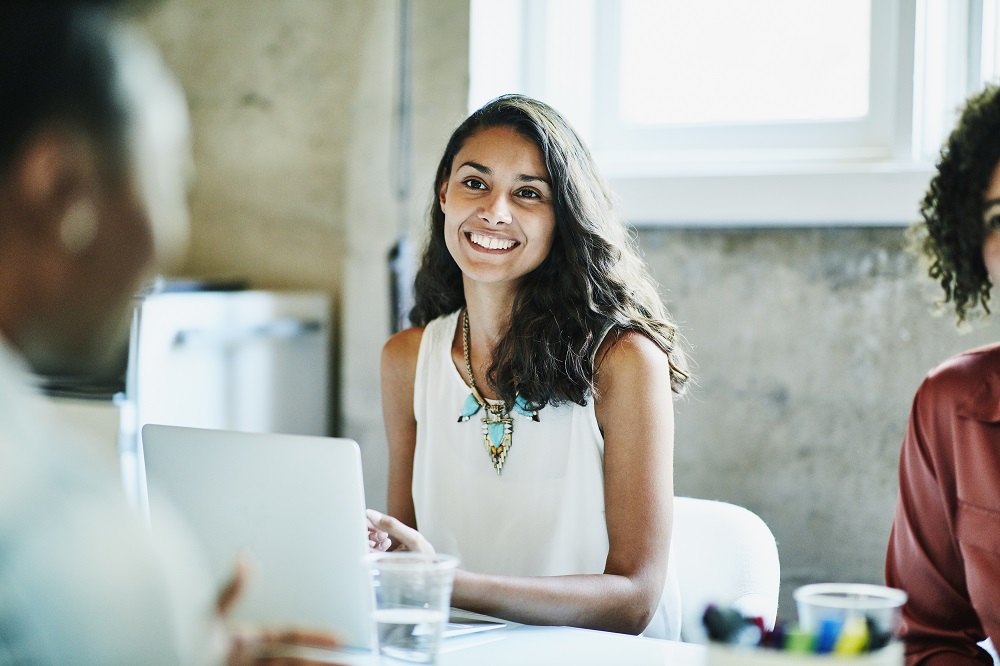 Woman sitting at her laptop with a bright smile. Her gaze is directed forward.