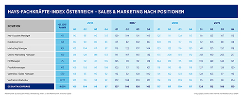 Bei den Sales & Marketing Experten fiel der Index zum Vergleichsquartal des Vorjahres gesamt um 7 Indexpunkte. Stärkste Position war diesmal jene des Online Marketing Managers (+ 45 Indexpunkte).