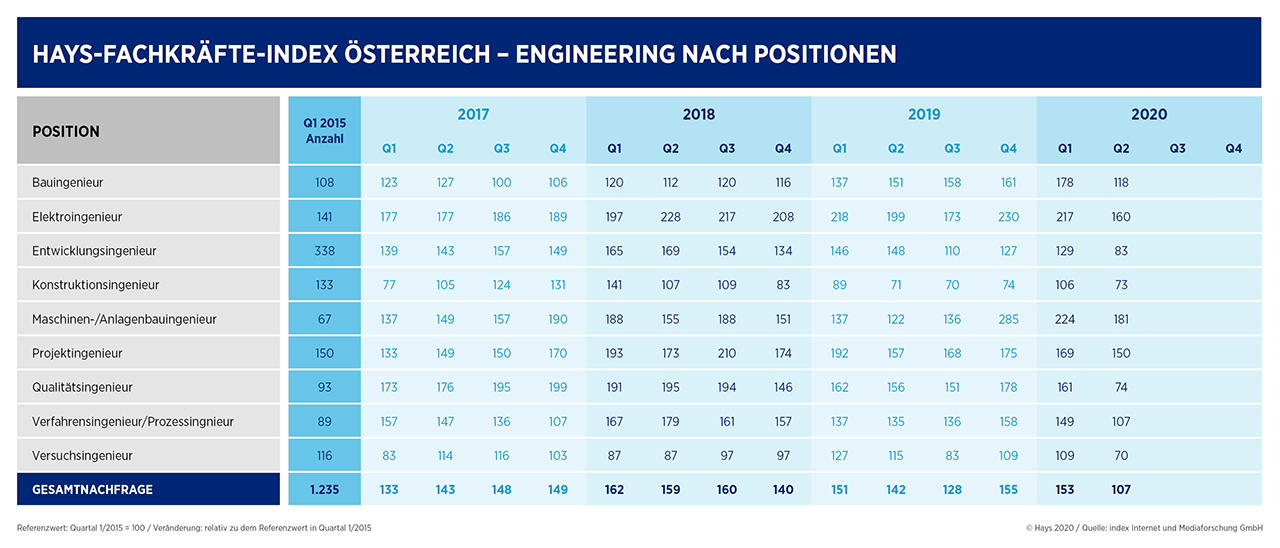 Der Hays Spezialisten-Index basiert auf einer quartalsweisen Auswertung der index Internet und Mediaforschung GmbH für Hays. Einbezogen werden Stellenanzeigen der meistfrequentierten Online-Jobbörsen, von Tageszeitungen sowie dem Business-Netzwerk Xing. Der Spezialisten-Index zeigt die prozentuale Veränderung zum Ausgangswert vom 1. Quartal 2015 an. Sämtliche Positionsbezeichnungen gelten grundsätzlich für alle Geschlechter.