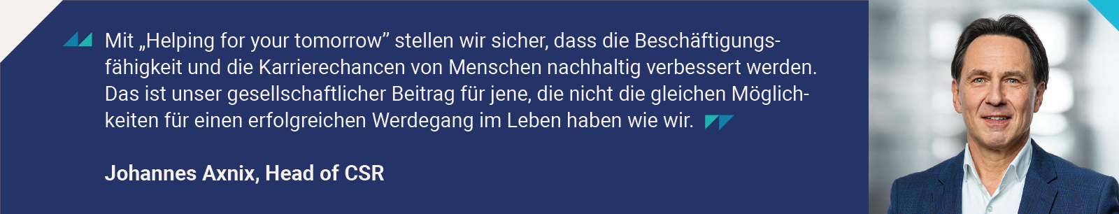 With our group-wide CSR project ‘Helping for your tomorrow’, we have set ourselves the goal of opening up new perspectives for people from disadvantaged backgrounds, awakening their talents and helping them to become fit for the job market. A positive side effect: In this way, we are already able to positively influence the working world of tomorrow.