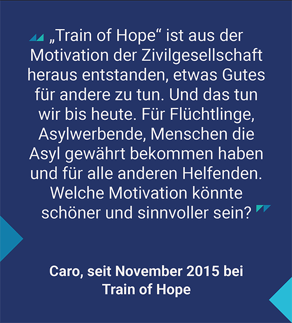 In 2015, a few helpers in Vienna joined forces under the name Train of Hope to provide first aid to those seeking protection at Vienna's main railway station. The association mainly used social media to organise direct help for refugees. Train of Hope was awarded the Human Rights Prize of the Austrian League for Human Rights for their extraordinary commitment. Due to the fact that the need for first aid at the main station decreased, the association decided to move the help to the places where the need arises.